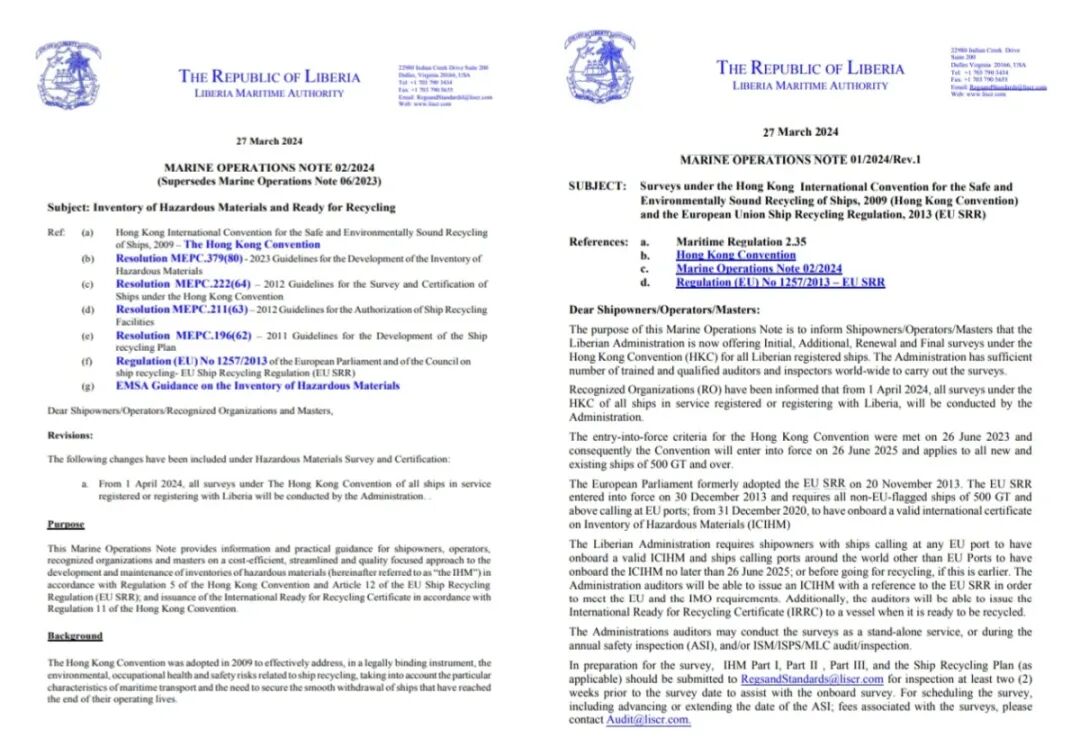 自2024年4月1日起,主管机关将对所有在利比里亚注册登记的营运船舶进行香港公约(HKC)检验,该机关在世界各地拥有足够数量、经过培训且合格的审核员和检查员来开展检验,其认可组织 (RO——即船级社)已收到相关通知。